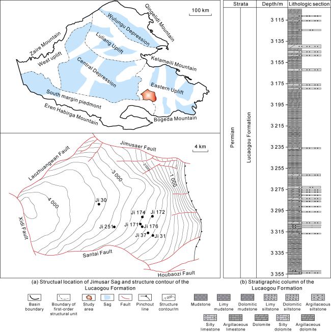 Fig. 1. Location and stratigraphic column of Jimusar Sag, Junggar Basin. |