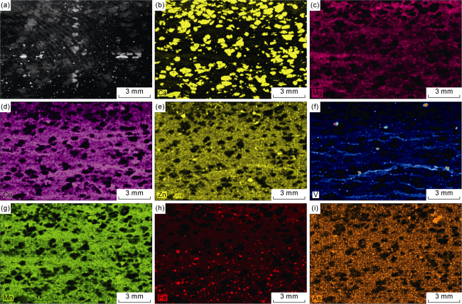 Fig. 10. Element distribution of granular calcite-containing sedimentary rocks of the Permian Lucaogou Formation in Jimusar Sag. (a) SEM image of core sample, Well Ji-251, 3768.8 m; (b)-(i) Distribution of Ca, Mg, Cu, Zn, V, Mn, Fe and As illustrated in Fig. a, showing dark matrix surrounding calcite rich in corresponding elements. |