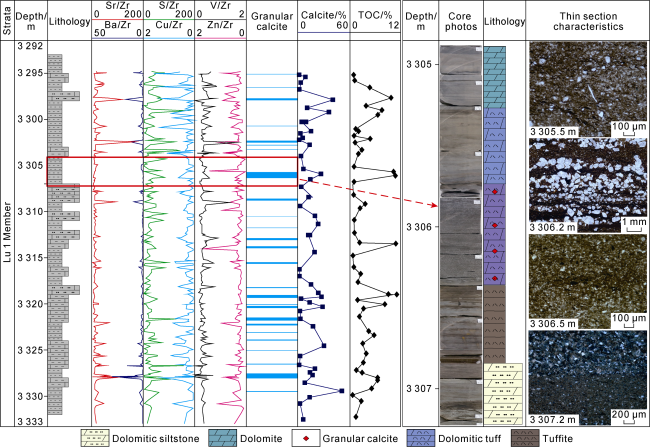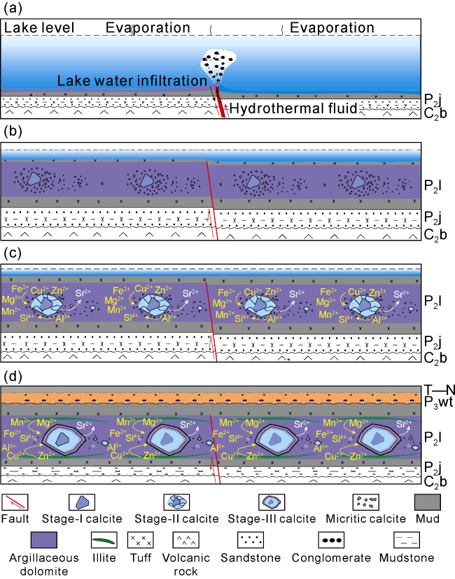 Fig. 11. Formation process of granular calcite in fine-grained sedimentary rocks of Permian Lucaogou Formation in Jimusar Sag. C2b—Carboniferous Batamayineishan Fm.; P2j—Permian Jingjingzigou Fm.; P2l—Permian Lucaogou Fm.; P3wt—Permian Wutonggou Fm.;T-N—Triassic-Neogene. |