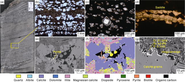 Fig. 3. Development characteristics of granular calcite in fine-grained sedimentary rocks of Permian Lucaogou Formation in Jimusar Sag. (a) Core photos with granular calcite, Well Ji174, 3302.5 m; (b) Plane-polarized image of the yellow box in Fig. a, showing calcite grains in bed-parallel distribution; (c) Plane-polarized image of calcite grains showing subhedral rhombus-xenomorphic texture, Well Ji-174, 3302.5 m; (d) Plane-polarized image of saddle calcite, Well Ji-31, 2896.1 m; (e) Backscattered electron image showing types and features of the minerals around granular calcite, Well Ji-174, 3302.5 m; (f) AMICS scanning image of Fig. e, Well Ji-174, 3313.8 m; (g) Backscattered electron image of fluorine-containing minerals around granular calcite, Well Ji-174, 3302.5 m. |