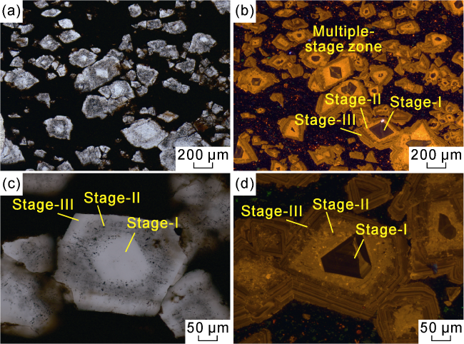 Fig. 4. Characteristics of granular calcite of different stages in fine-grained sedimentary rocks of the Permian Lucaogou Formation, Jimusar Sag (Well Ji-174, 3302.5 m). (a) Plane-polarized image of granular calcite; (b) CL image with the same field of view as Fig. a, showing calcite characterized with CL zonal texture, which can be divided into three stages; (c) Plane-polarized image showing characteristics of three stages of calcite; (d) CL image with the same field of view as Fig. c, showing CL characteristics of three stages of calcite. |