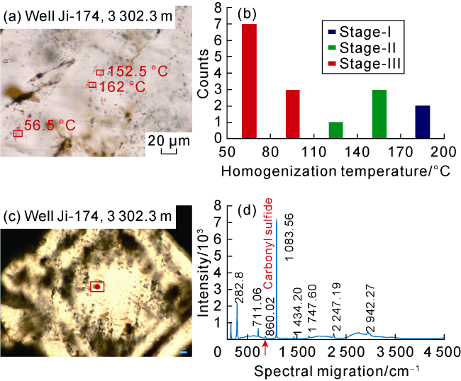 Fig. 6. Inclusions of granular calcite in fine-grained sedimentary rocks of the Permian Lucaogou Formation in Jimusar Sag. (a) Distribution of homogenization temperature of inclusions in granular calcite; (b) Homogenization temperatures of inclusions of calcite of different stages; (c) Location of the area selected for laser Raman spectroscopic analysis; (d) Laser Raman spectrum for the inclusion in Fig. c. |