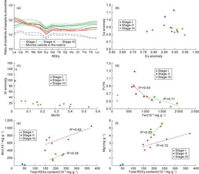 Fig. 7. Elemental composition of granular calcite in fine-grained sedimentary rocks of the Permian Lucaogou Formation in Jimusar Sag. (a) REEs distribution pattern of granular calcite, the data of chondrite from Ref. [27]; (b) Anomaly characteristics of Ce and Eu in granular calcite; (c) Sr anomaly and Mn/Sr characteristic in granular calcite; (d) Pr/Yb-Fe diagram of granular calcite; (e) Relationship between Mn and total REEs content of granular calcite; (f) Relationship between Mg and total REEs content of granular calcite. |
