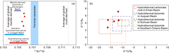 Fig. 8. Distribution of isotopes in granular calcite in fine-grained sedimentary rocks of the Permian Lucaogou Formation in Jimusar Sag. (a) Distribution of Sr isotopes in granular calcite, data from Refs. [19⇓-21]; (b) Distribution of C and O isotopes in granular calcite, the base map modified from Ref. [22]. |
