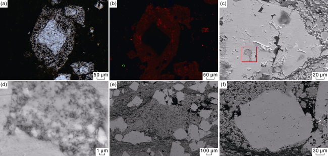 Fig. 9. Characteristics of calcite-containing sedimentary rocks of the Permian Lucaogou Formation in Jimusar Sag. (a) Plane-polarized image of massive calcite, Well Ji-31, 2896.1 m; (b) CL image with the same field of view as that in Fig. a, showing calcite mass composed of non-luminescence core and dark red luminescence rim, and recrystallized part characterized with bright yellow luminescence, Well Ji-31, 2896.1 m; (c) Backscattered electron image of micritic calcite in incompletely crystallized calcite, Well Ji-174, 3302.5 m; (d) Enlarged backscattered electron image of the red box in Fig. c, Well Ji-174, 3302.5 m; (e) Backscattered electron image of showing micritic calcite in matrix, Well Ji-174, 3302.5 m; (f) Backscattered electron image, showing micritic calcite composing the rim of granular calcite, Well Ji-174, 3302.5 m. |