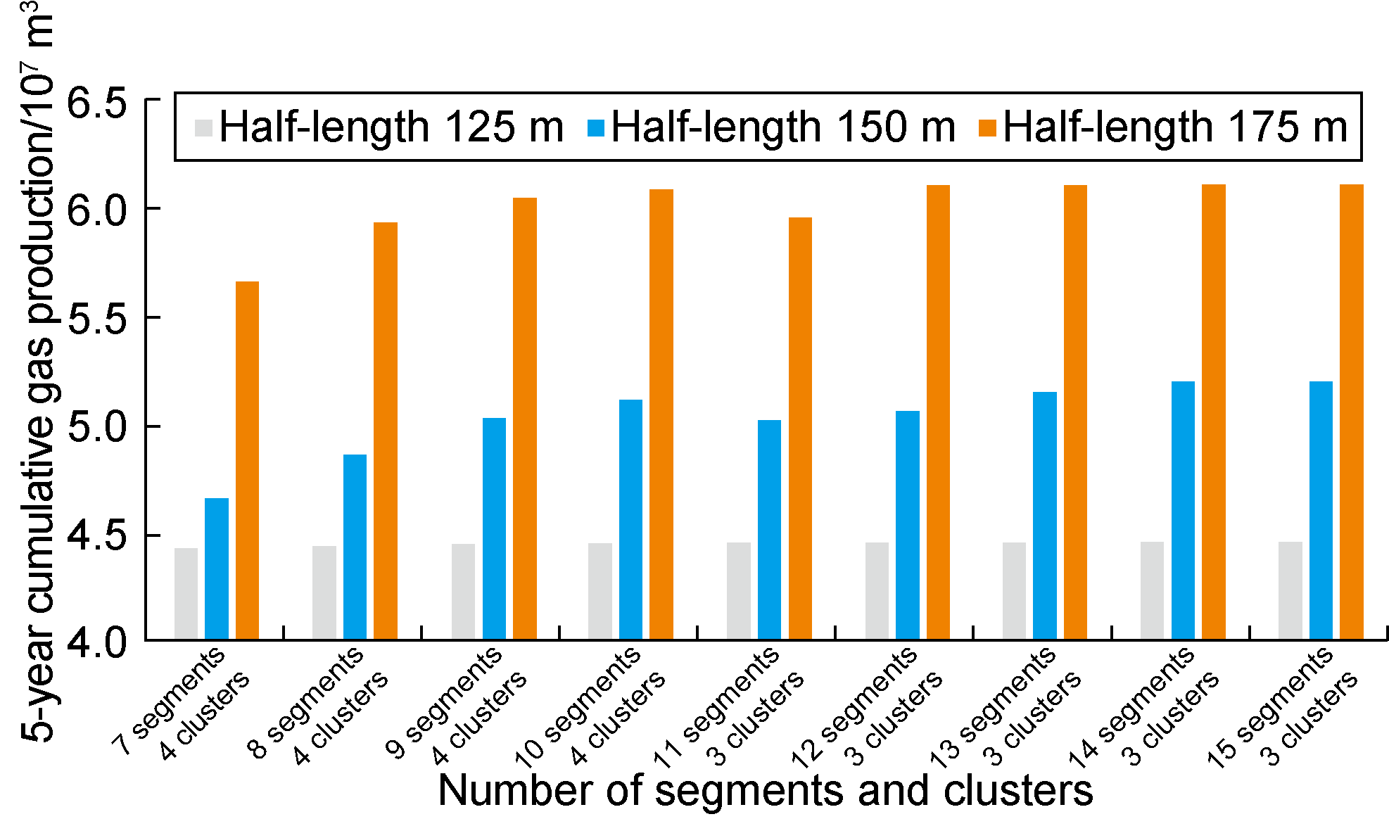 Fig. 4. Comparison of 5-year cumulative gas production under different segmented conditions. |