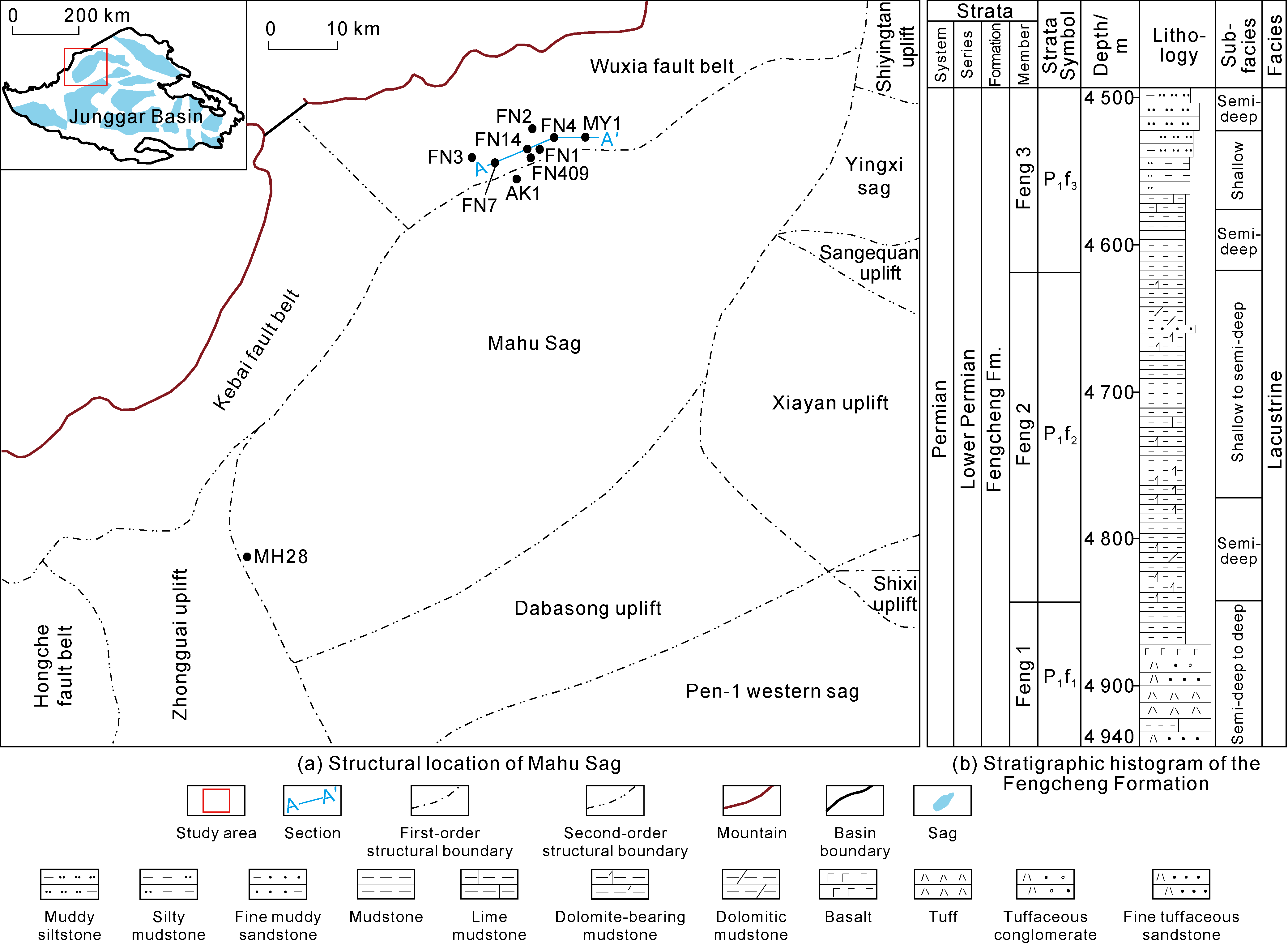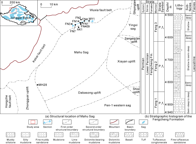 Fig. 1. Structural location and stratigraphic histogram of the Mahu Sag, Junggar Basin (modified from Reference [5]). |