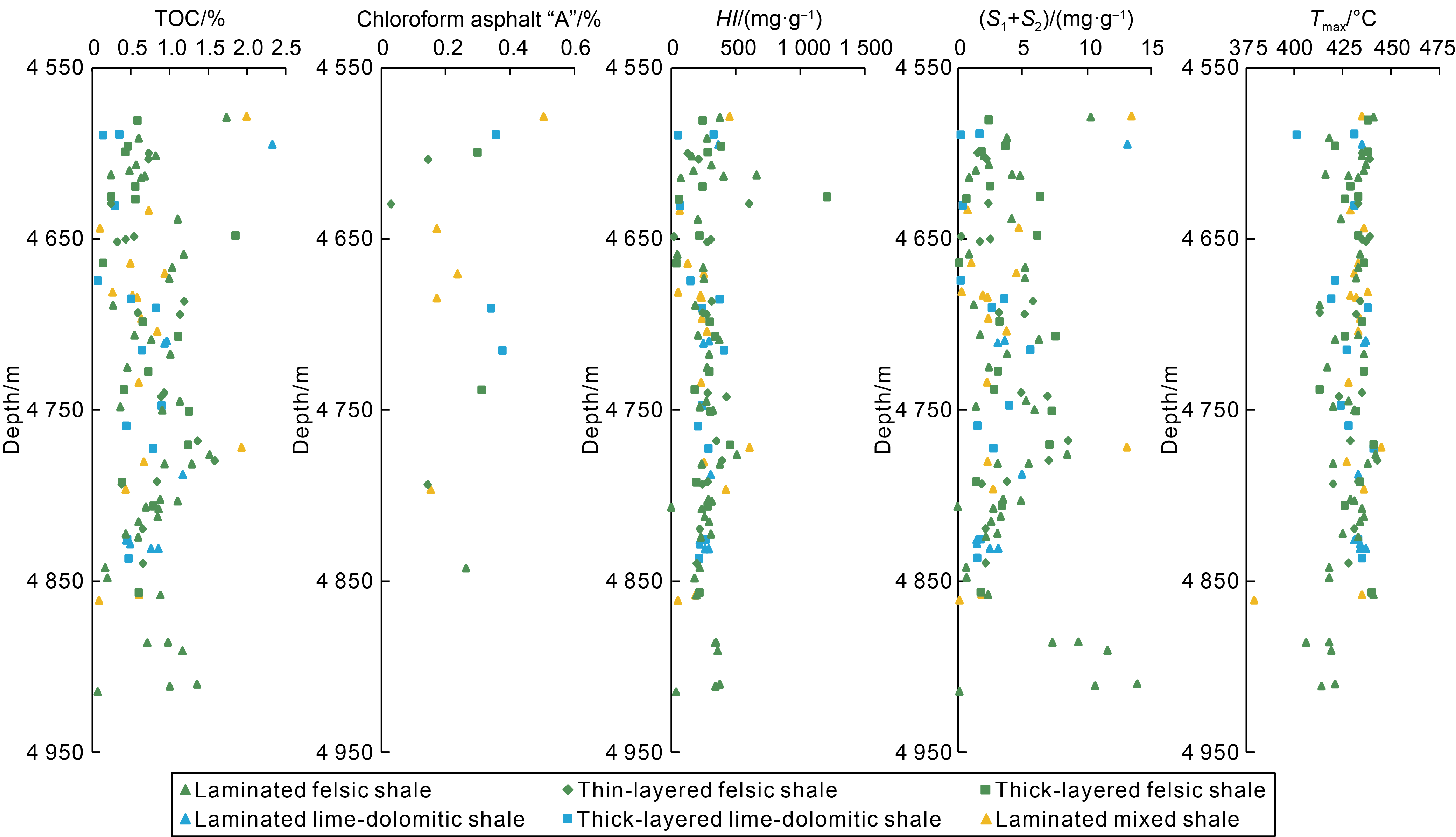 Fig. 3. Geochemical features of Fengcheng Formation shale in Well MY1 in Mahu Sag. |