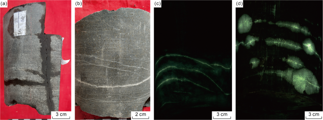 Fig. 11. Oil in fractures of Fengcheng Formation shale samples taken in Well MY1, Mahu Sag. |