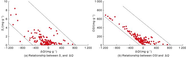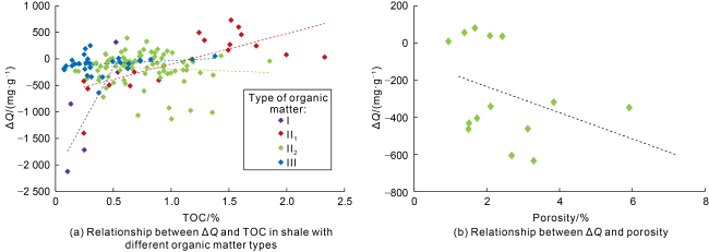 Fig. 13. Relationships between ΔQ and TOC and porosity of Fengcheng Formation shale, Mahu Sag. |