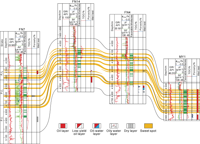 Fig. 16. Sweet spots predicted in the Fengcheng Formation, Mahu Sag (see the section location in |