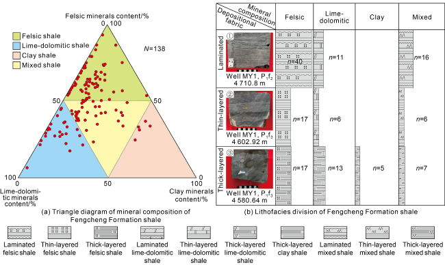 Fig. 2. Shale lithofacies division of the Fengcheng Formation in Well MY1 (the width of lithofacies composition represents the proportion of lithofacies samples n of total samples N). |