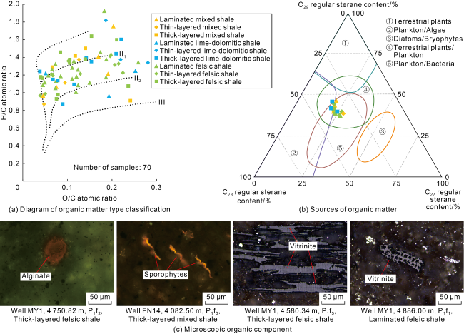 Fig. 4. Types and components of organic matters in Fengcheng Formation shale in Mahu Sag. |