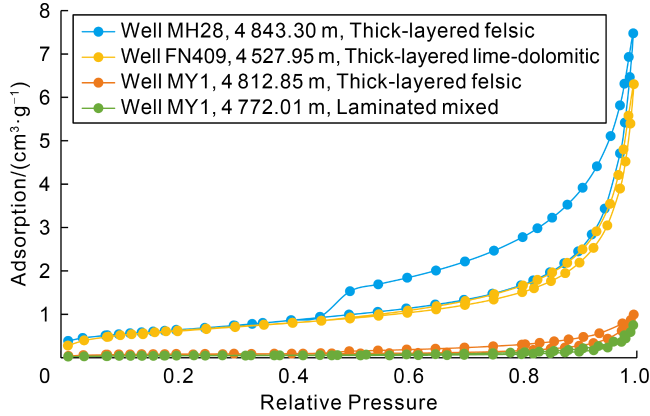 Fig. 6. Low-temperature N2 adsorption-desorption curves of shale in the Fengcheng Formation, Mahu Sag. |