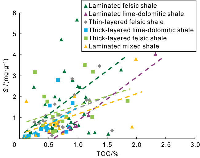 Fig. 8. Relationship between S1 and TOC of different lithofacies of shale in the Fengcheng Formation, Mahu Sag. |