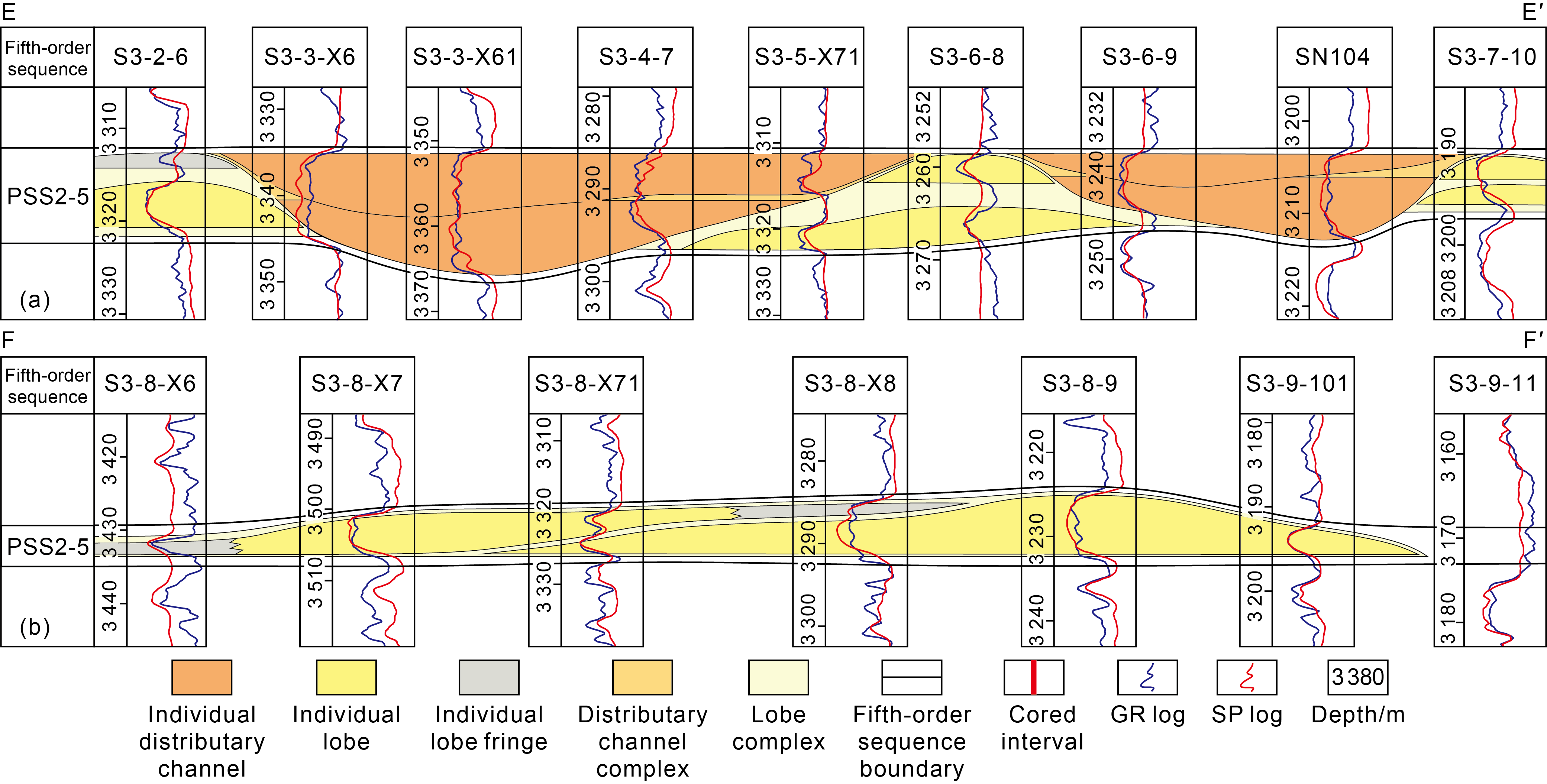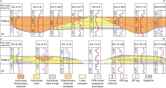 Fig. 10. Architectural profile of channel and lobe in dendritic sublacustrine fans at the rising stage (PSS2-9) of fourth-order base-level (see |