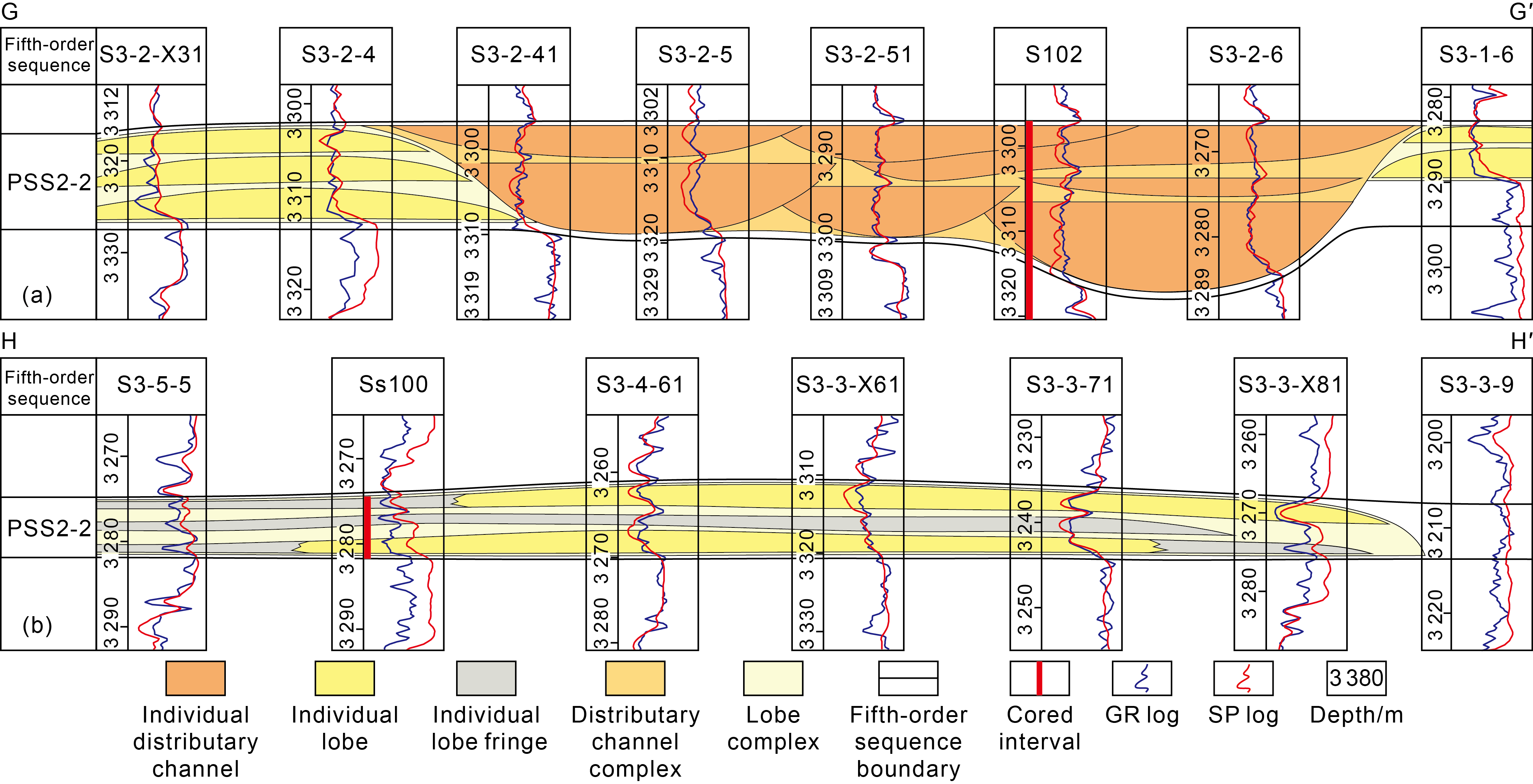 Fig. 11. Architectural profile of channel and lobe in dendritic sublacustrine fans at the early falling stage (PSS2-5) of fourth-order base-level (see |