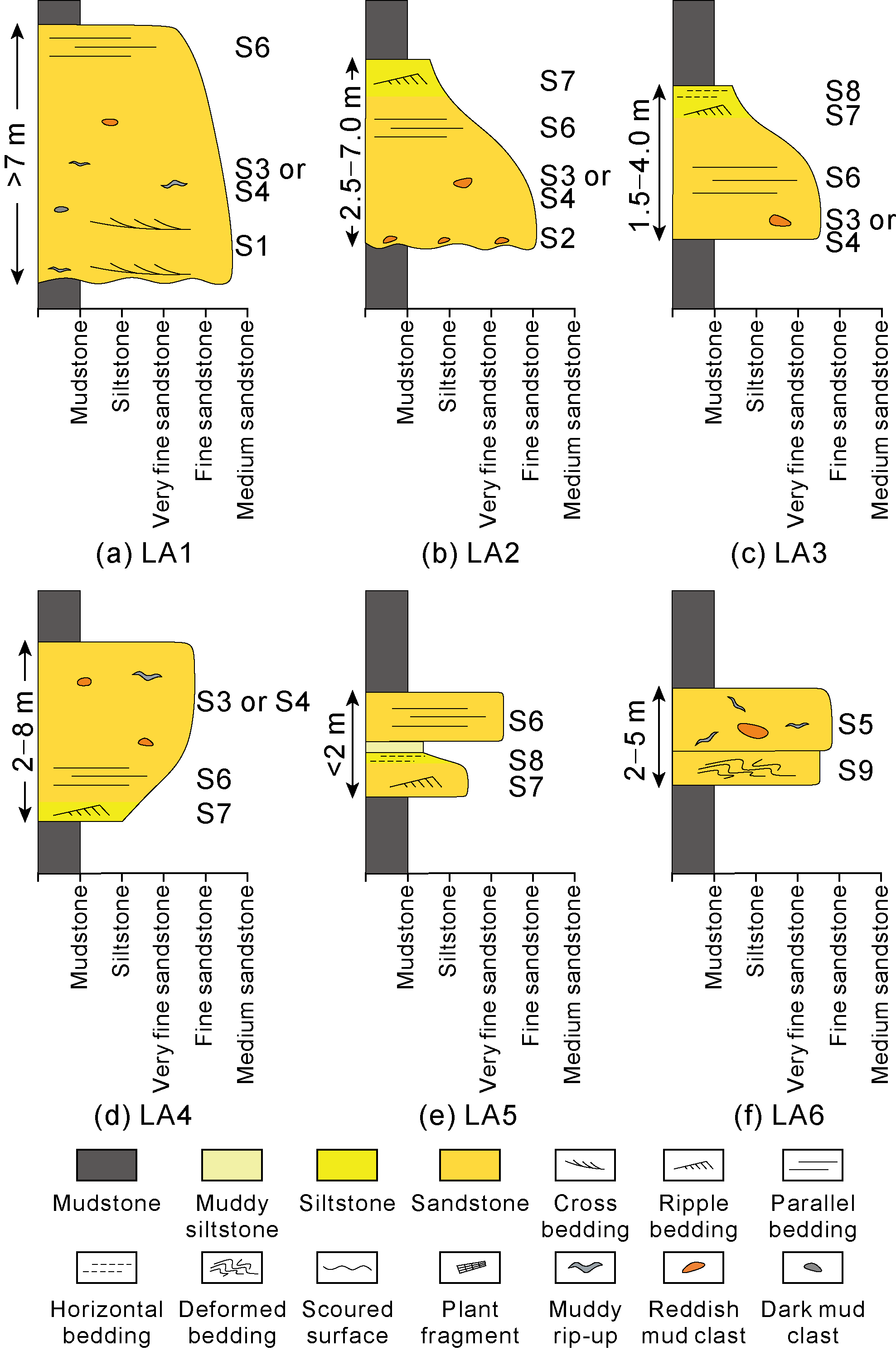 | Fine sandstone with cross-bedding (S1) | Cross-bedding, sometimes with a little plant fragments and muddy rip-ups at the bottom | Bed-load transport [6-7] | Quasi-steady high-density turbidity current [10,22] |