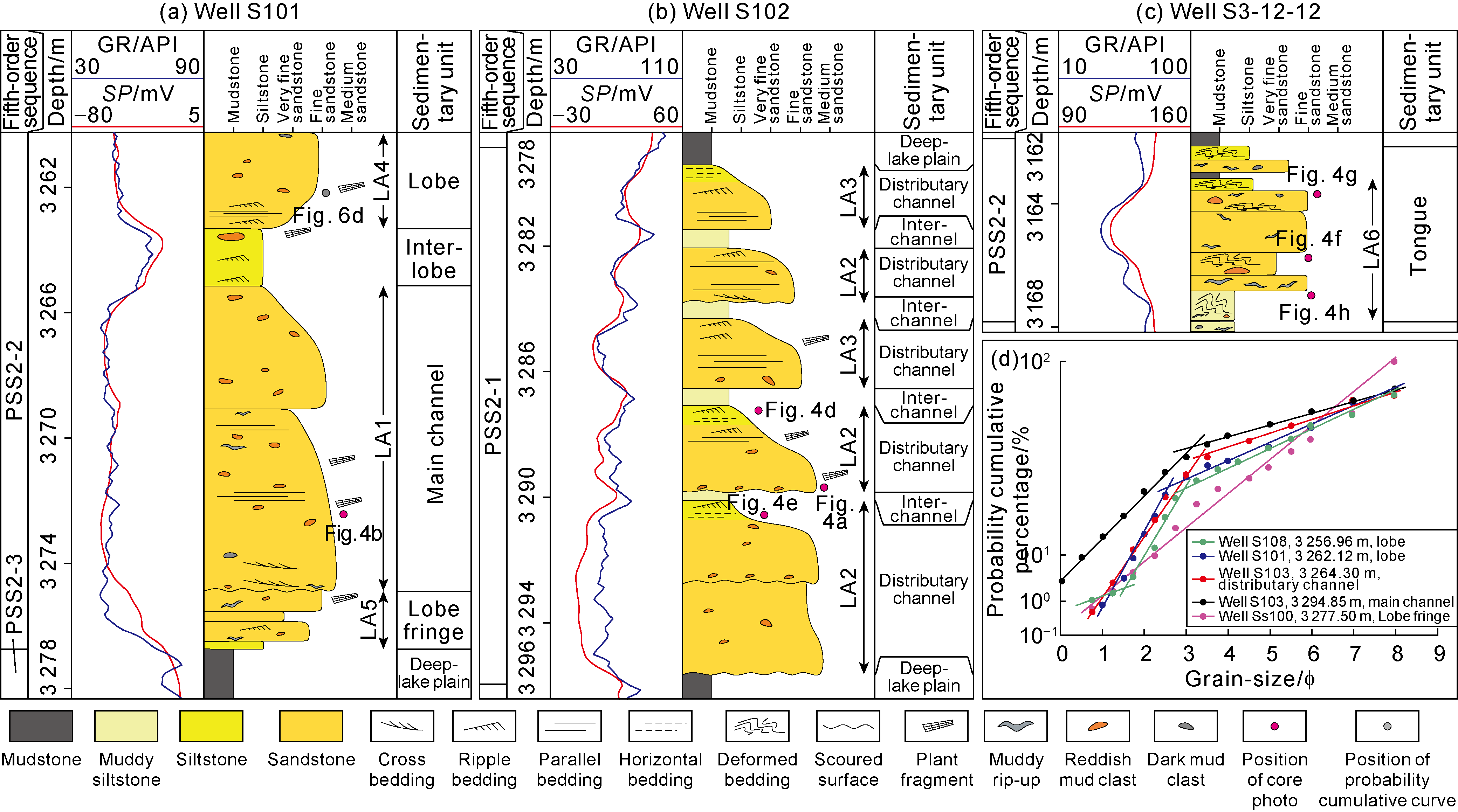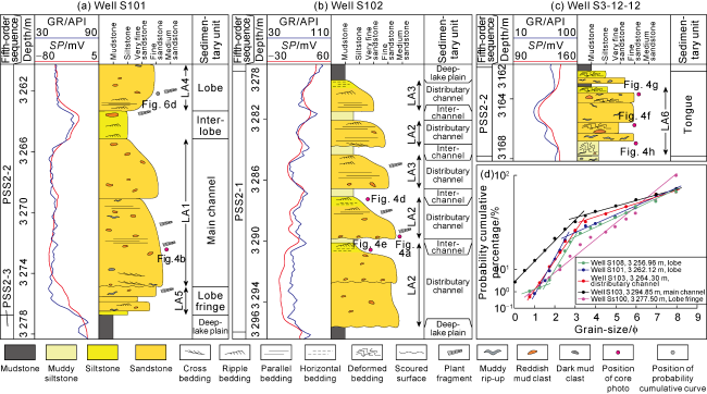Fig. 6. Sedimentary sequences and grain-size probability cumulative curves of sedimentary units in the study area. GR—gamma ray; SP—spontaneous potential. |
