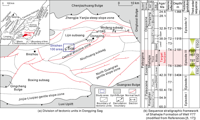 Fig. 1. Division of tectonic units and sequence stratigraphic framework of Shahejie Formation in Dongying Sag. LST—lowstand systems tract; TST—transgressive systems tract; HST—highstand systems tract; FSST—falling stage systems tract. |