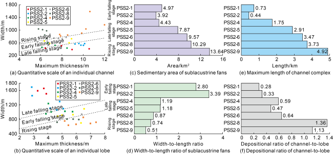 Fig. 13. Quantitative characterization parameters of dendritic sublacustrine fans at different stages. |