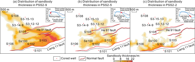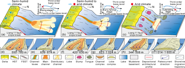 Fig. 14. Control of the fourth-order base-level changes on planar morphology and depositional architecture of sublacustrine fans. |