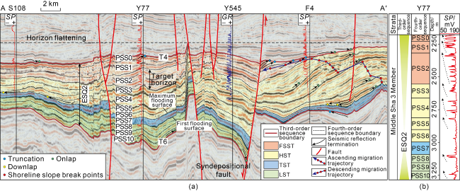 Fig. 2. Interpretation of fourth-order sequence of ESQ2 in Middle Sha 3 Member of Well Y77 in Dongying Sag (section location shown in |