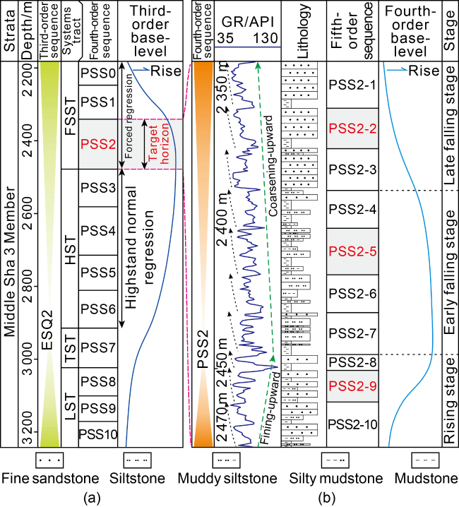 Fig. 3. (a) Third-order base-level changes in ESQ2 and (b) division of fifth-order sequence and fourth-order base-level changes in PSS2 of Well Y545. |