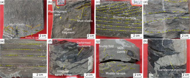 Fig. 4. Typical core photos of gravity flow sandstones in PSS2. (a) Well S102, 3291.26 m, clean massive fine sandstone (S3) in the upper part and massive fine sandstone with imbricated mud-clasts (S2) in the lower part, where mud-clasts are arranged in imbricate form and close to the scoured surface; (b) Well S103, 3294.25 m, massive fine sandstone with floating clasts (S4), layered plant fragments visible on top; (c) Well S106, 3411.67 m, fine sandstone with cross-bedding (S1) and fine sandstone with parallel bedding (S6), separated by scoured surfaces; (d) Well S102, 3287.24 m, siltstone with ripple bedding (S7); (e) Well S102, 3290.55 m, muddy siltstone with horizontal bedding (S8); (f) Well S3-12-12, 3165.82 m, sandstone with deformed bedding (S9), with deformed mudstone and irregular sandy mass; (g) Well S3-12-12, 3163.60 m, massive fine sandstone with muddy rip-ups (S5); (h) Well S3-12-12, 3166.89 m, sandstone with deformed bedding (S9), with sandstone injections. |