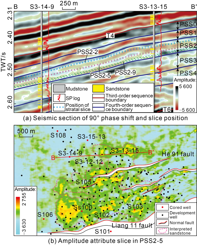 Fig. 7. 90° phase-shifted seismic section and amplitude attribute slice in the study area. |