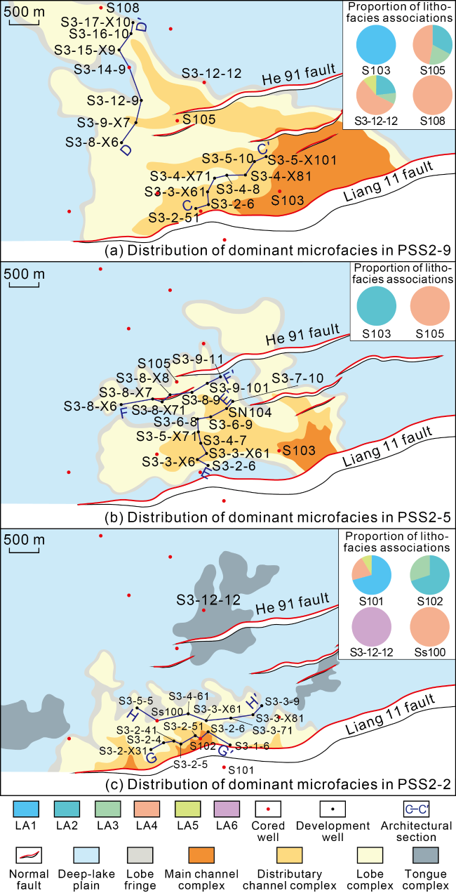 Fig. 9. Dominant sedimentary microfacies and thickness proportion of lithofacies associations of cored wells during PSS2 in the study area. |