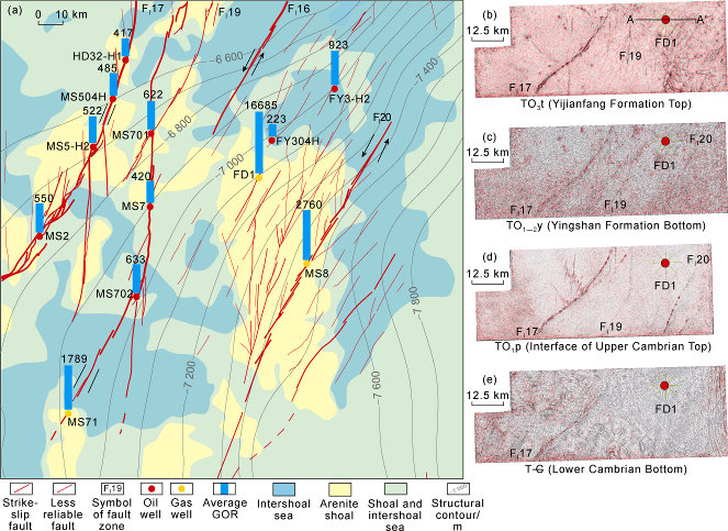 Fig. 3. (a) Structures, sedimentation, and GOR distribution at the top of the Yijianfang Formation around well FD1 and (b-e) fault morphology index maps with 0.25 subduction coefficient. |