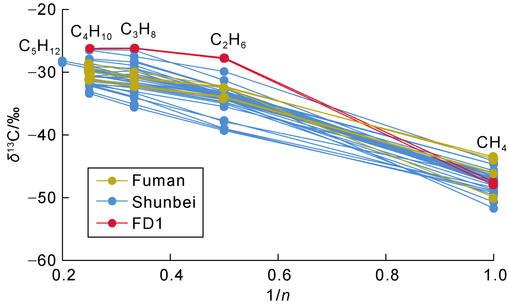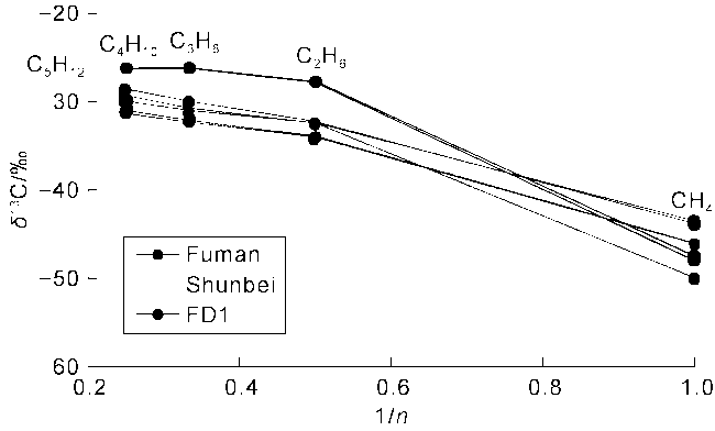 Fig. 7. Relationship between the reciprocal of carbon number (1/n) of natural gas and its stable carbon isotope composition. |