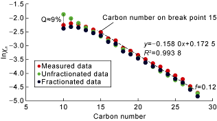 Fig. 10. Relationship between the carbon number (n) and lnχn of n-alkanes of crude oil from well FD1 (f is the theoretical difference of the molar mass logarithm between measured mass of n-alkane and fractionated mass; χn is the molar content of n-alkanes with carbon number n; Q is the loss of n-alkanes). |