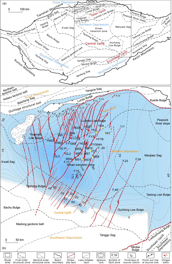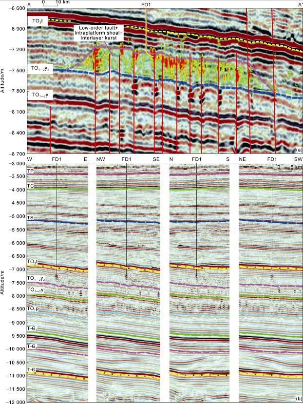 Fig. 4. 3D seismic profile across well FD1 (see the section location in Fig. 3). (a) AA' seismic profile; (b) "米-type" seismic profile. TP—Bottom of the Permian; TC—Bottom of the Carboniferous; TS—Bottom of the Silurian; TO3t—Bottom of the Tumuxiuke Formation; TO1—2y2—Bottom of the second submember of Upper Yingshan Formation; TO1—2y—Bottom of Yingshan Formation; TO1p—Bottom of Penglaiba Formation; T—C3—Bottom of Upper Cambrian; T—C2—Bottom of Middle Cam-brian; T—C—Bottom of Cambrian. |