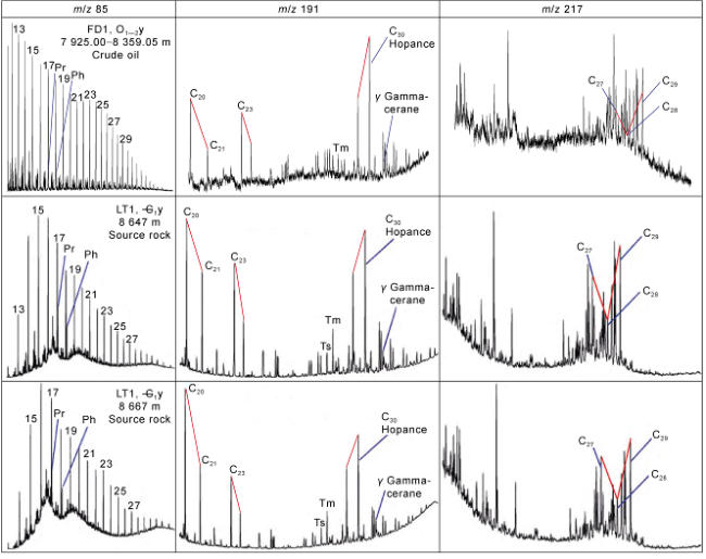 Fig. 6. Comparison of biomarkers of crude oil from well FD1 with the source rock of Yuertusi Formation in well LT1 (adapted from Reference [21]). |