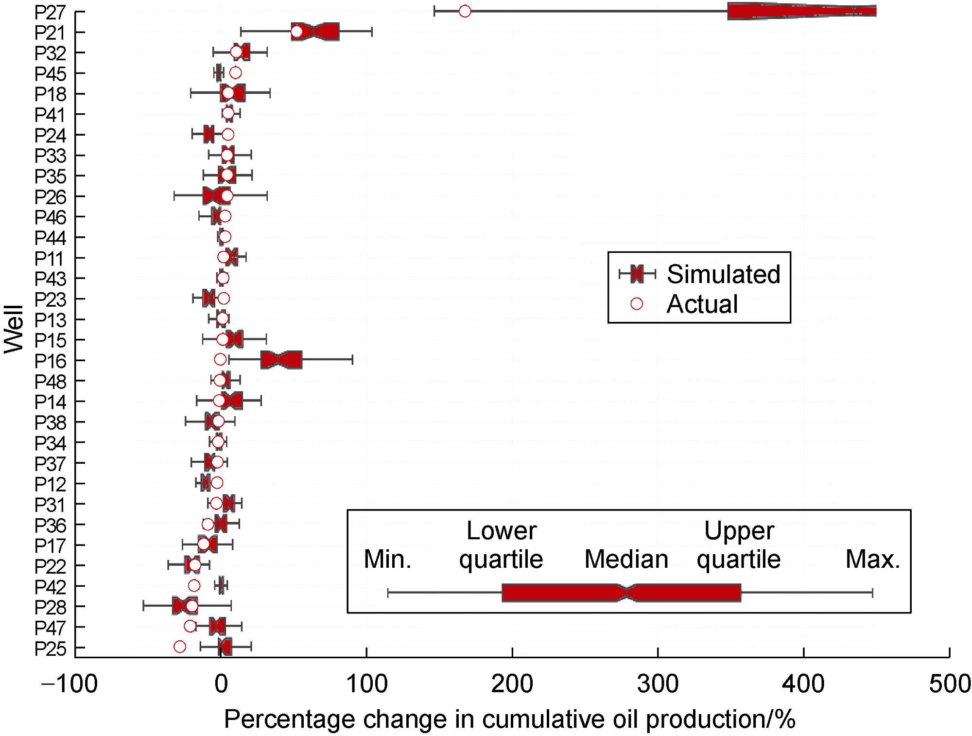 Fig. 3. Percentage change in cumulative oil production of respective wells at the end of Cycle 1 (to make the graph legible, we truncated the result of P27 as the maximum change was observed as high as 1500%). |