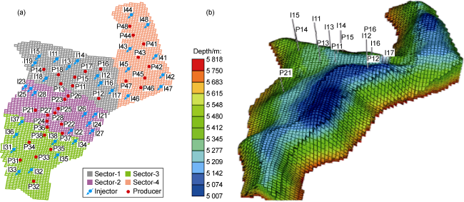 Fig. 2. (a) Sectors distribution and (b) grid-map of UNISIM-III-2022 (the first and second numbers in the well’s nomenclature refer to the sector and drilling sequence, respectively). |