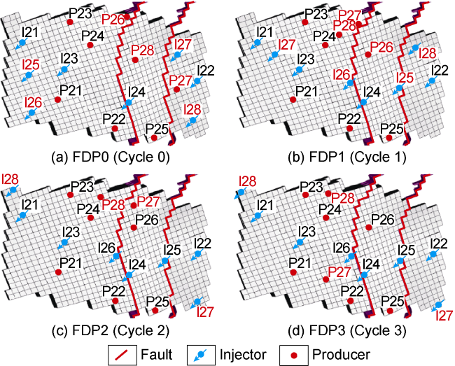 Fig. 6. Best FDP obtained at the end of each cycle (to-be-drilled wells are highlighted in red). |