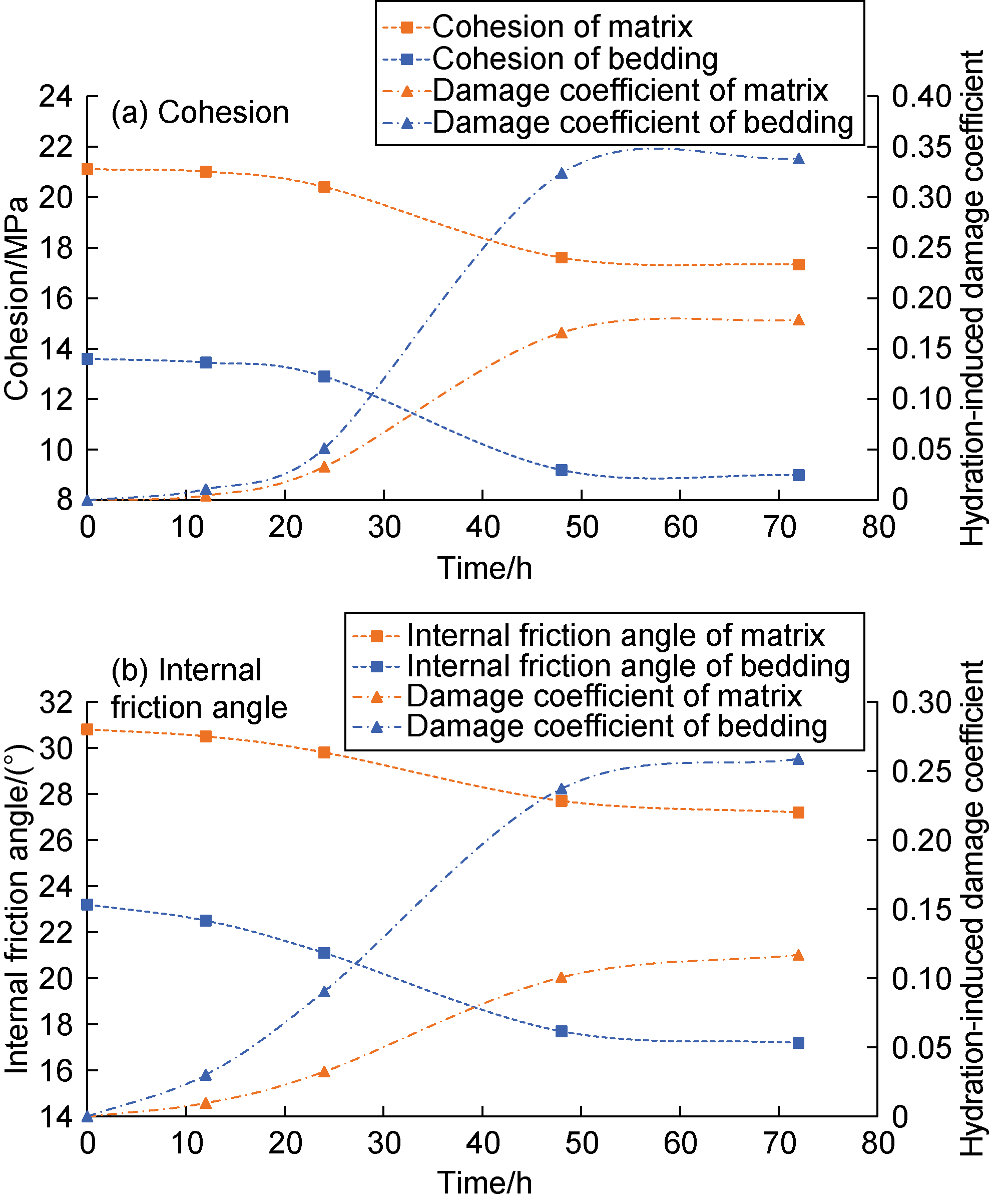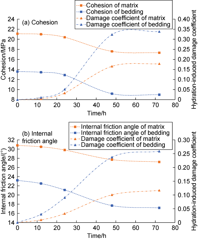 Dhbc(t), Dhbi(t)—hydration damage coefficients of bedding cohesion and bedding internal friction angle at time, dimensionless;