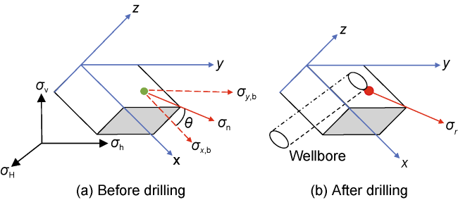 σx,h, σy,h—boundary stresses along x-axis, y-axis of the wellbore after drilling, MPa;