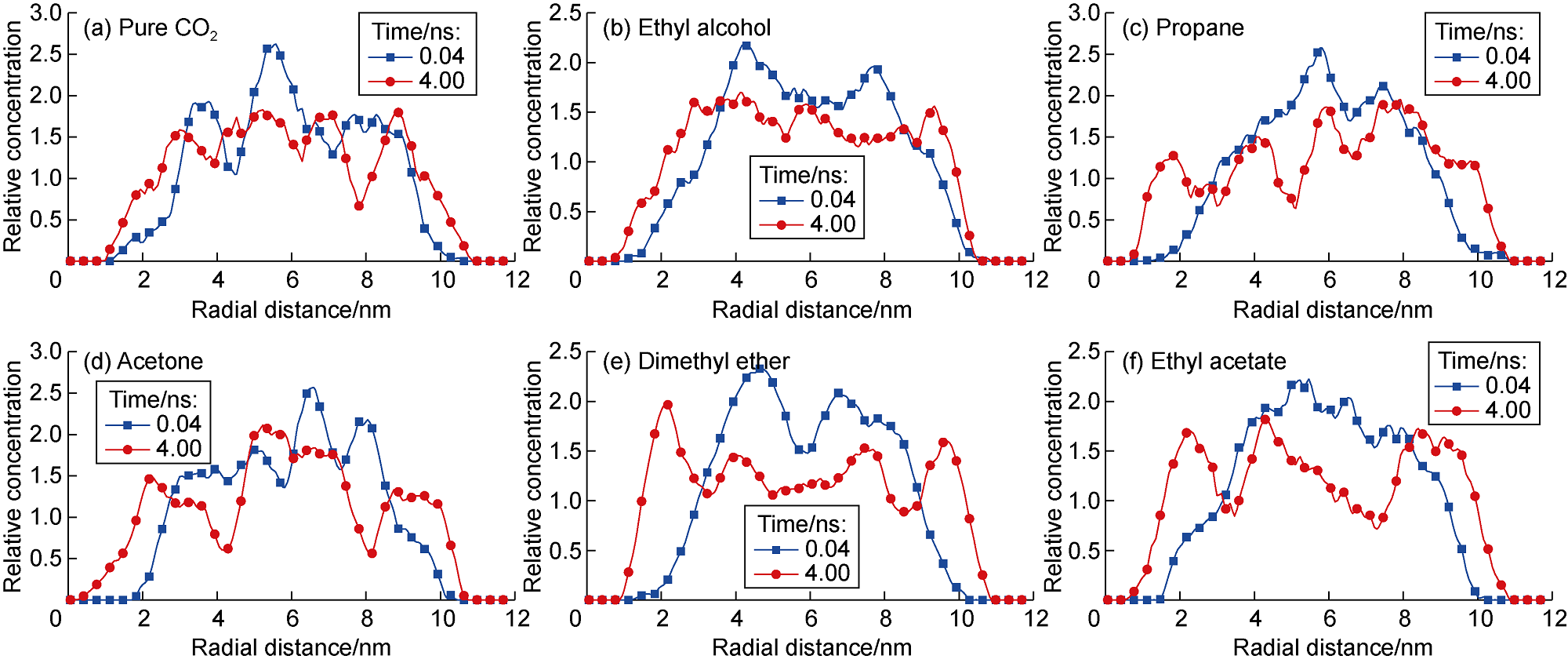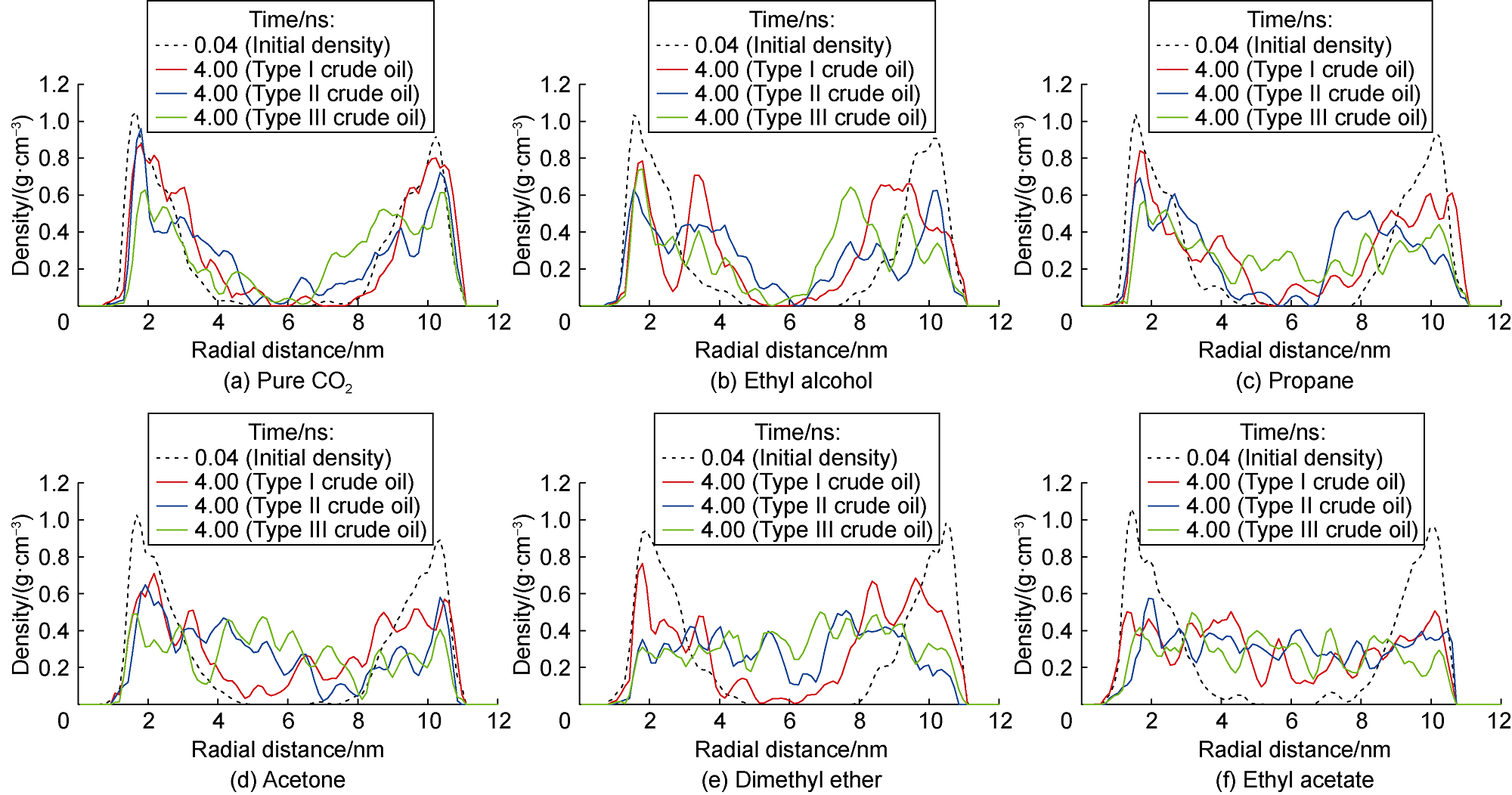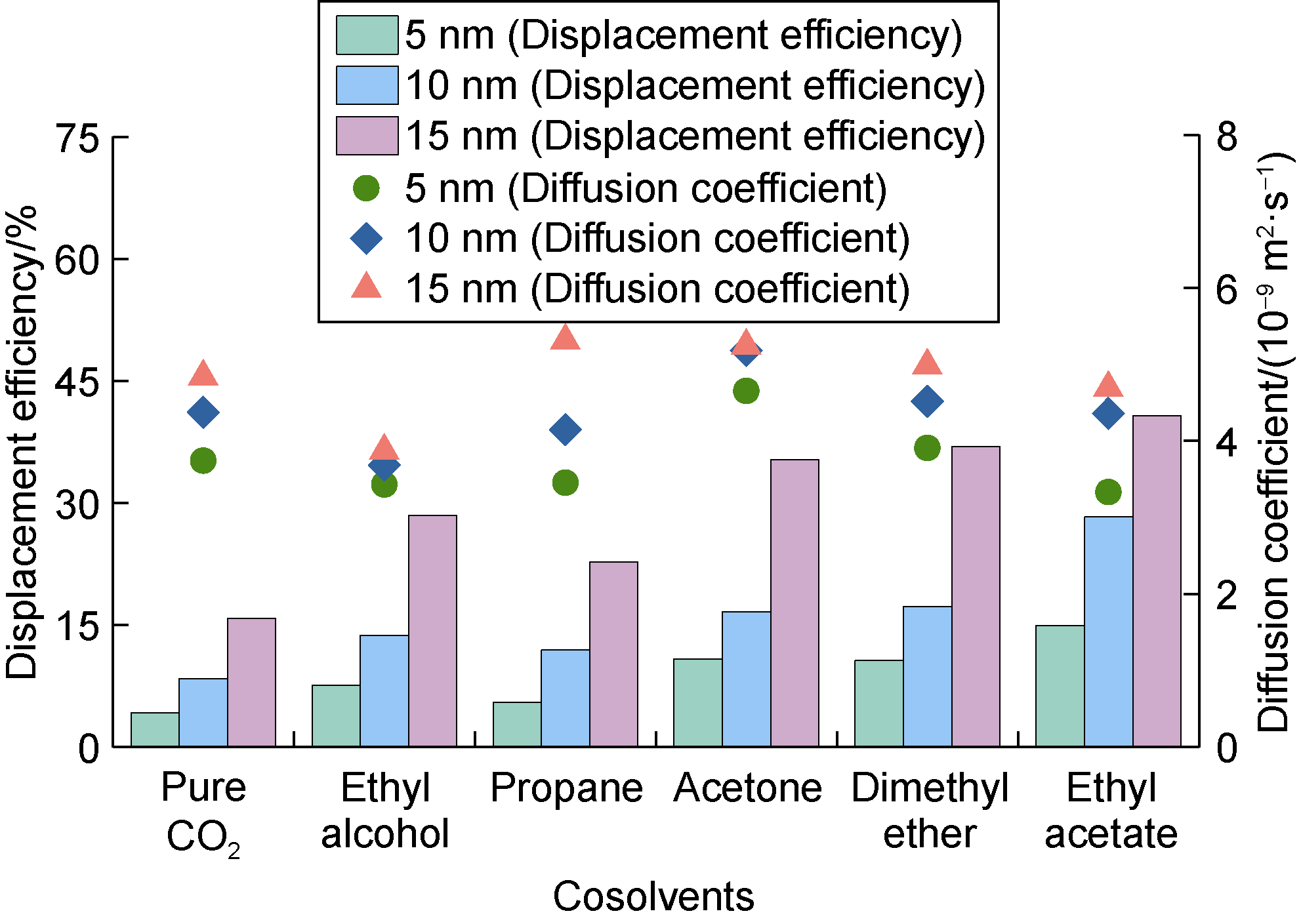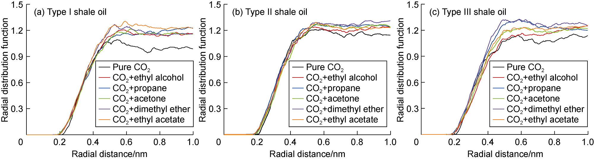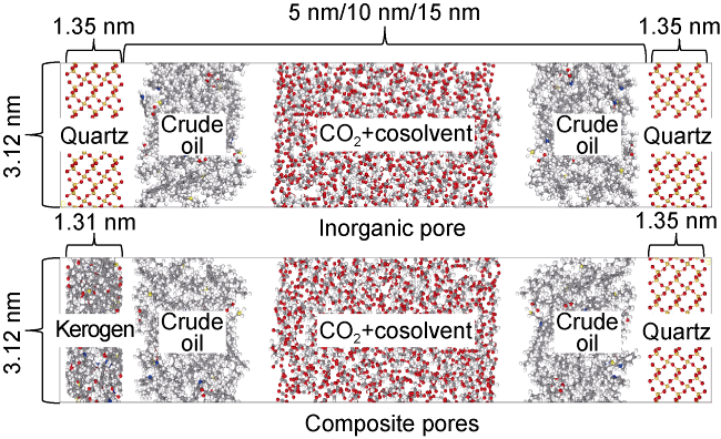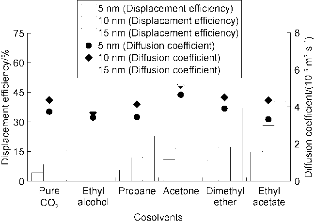 Fig. 7 shows the displacement efficiency of three types of shale oil under the influence of different cosolvents in 10 nm composite pore. The following results can be obtained from this figure. (1) The displacement efficiency of shale oil by pure CO