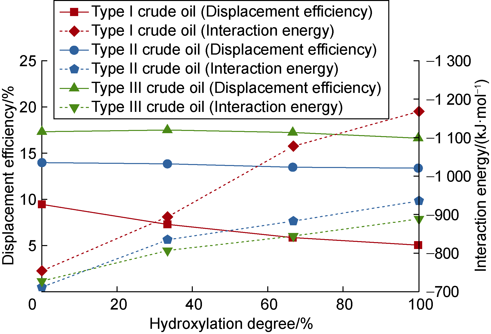 2+ethyl acetate on Type III shale oil reached 43.81% and 47.63%, respectively; when pressure increased to 30 MPa and 40 MPa, the displacement efficiency on Type III shale oil reached 48.12% and 52.80%, respectively. This is because the increase in temperature results in more intense molecular movement, and the increase in pressure results in an increase in fluid density and a shortening of mass transfer distance between the two phases, which increases the solubility of CO