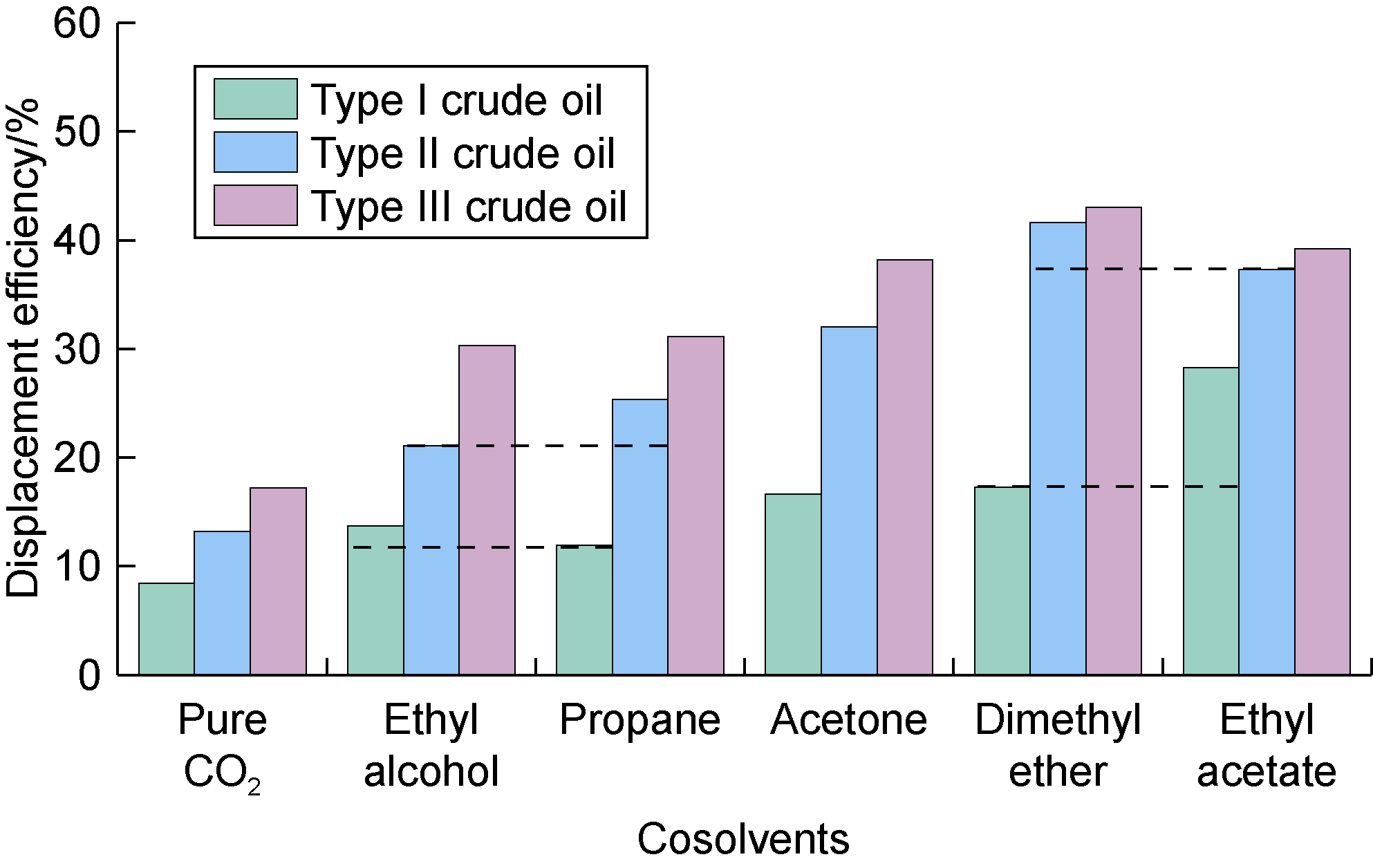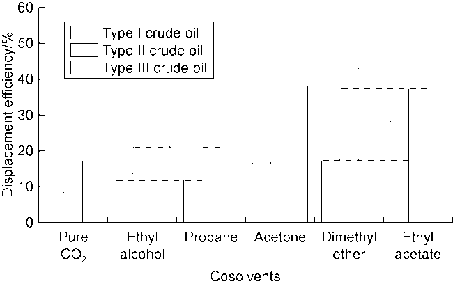 2 is the lowest, 8.42% for Type I, 13.24% for Type II and 17.23% for Type III. (2) The displacement efficiencies were all significantly enhanced with the addition of cosolvents. Dimethyl ether brought the greatest enhancement, followed by ethyl acetate, and ethanol the worst. This is mainly caused by the strong interaction between ether group and CO