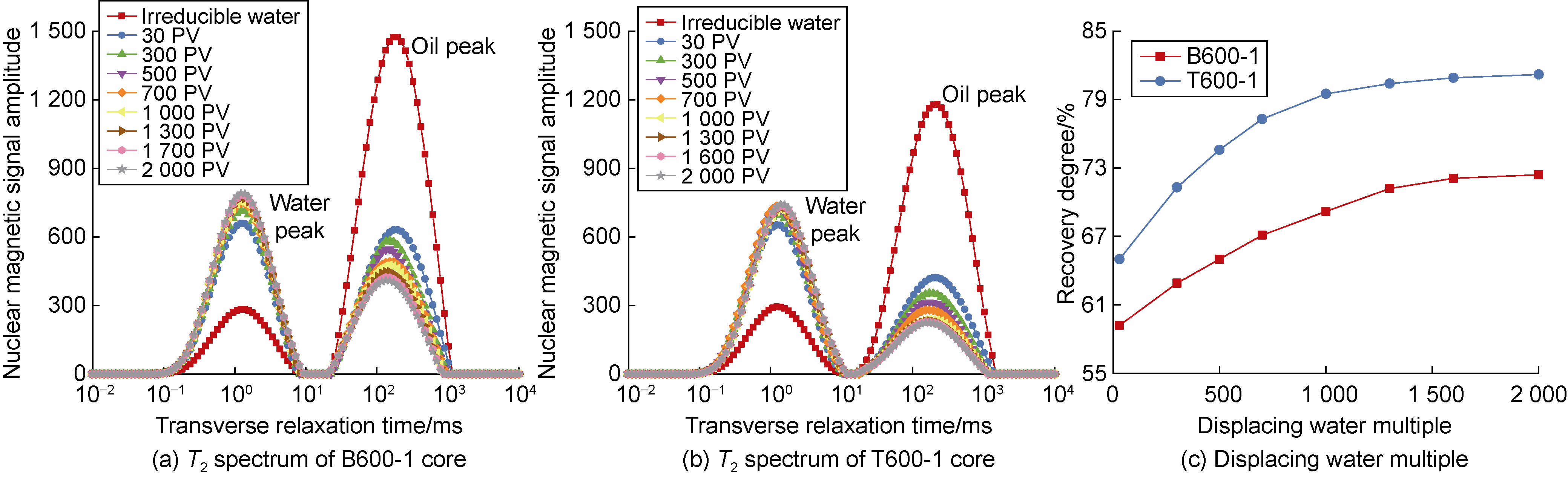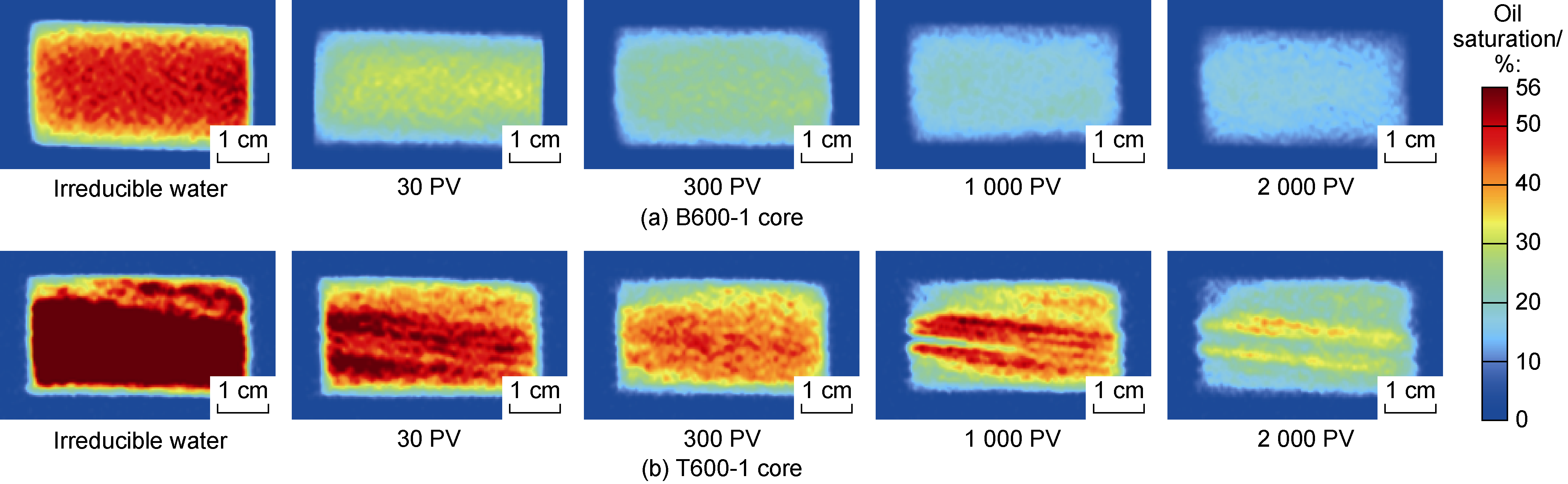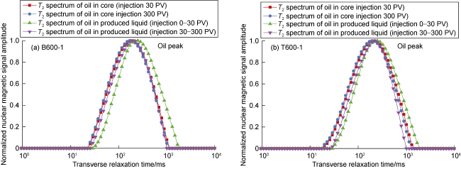 T2 spectrum of the core in the irreducible water state, and scan and image the cross-section of the core; (4) Use manganese water to displace oil, close the inlet and outlet gate valves when the injection volume reaches 30, 300, 500, 700, 1 000, 1 300, 1 600, 2 000 PV, and measure and image the