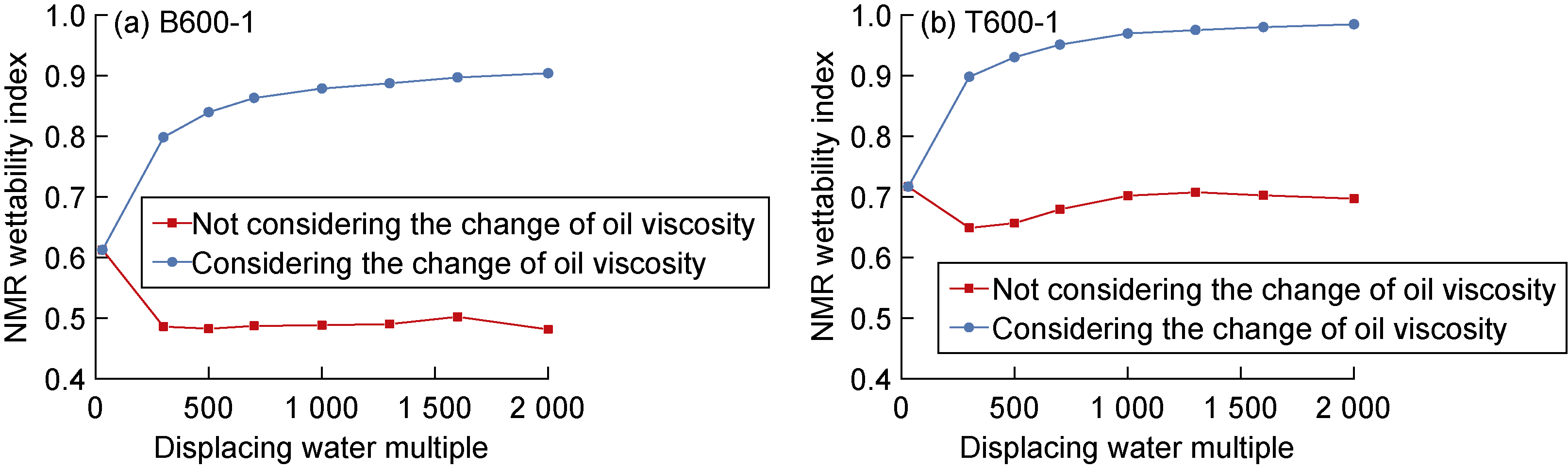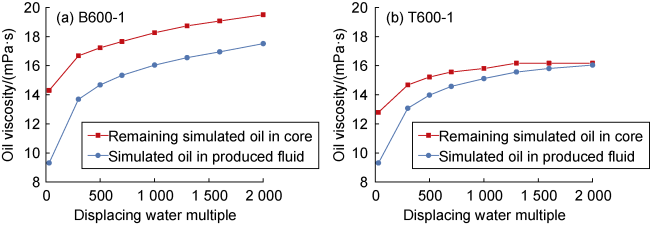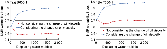 5], increasing from the industry standard of 30 PV (pore volume multiple) to 2 000 PV. The experiment on the time-varying law of rock wettability and oil viscosity during high multiple waterflooding mainly considers the cumulative flooding effect of injected water, that is, the relationship of rock wettability and oil viscosity with displacing water multiple. The experimental steps are: (1) Measure the