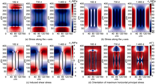 [4] proved for the first time through experiments that initial fracturing of oil and gas wells could reverse the principal stress direction by 90°. Subsequently, Wright et al.