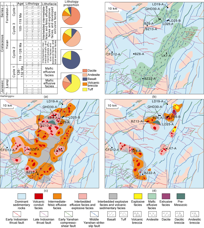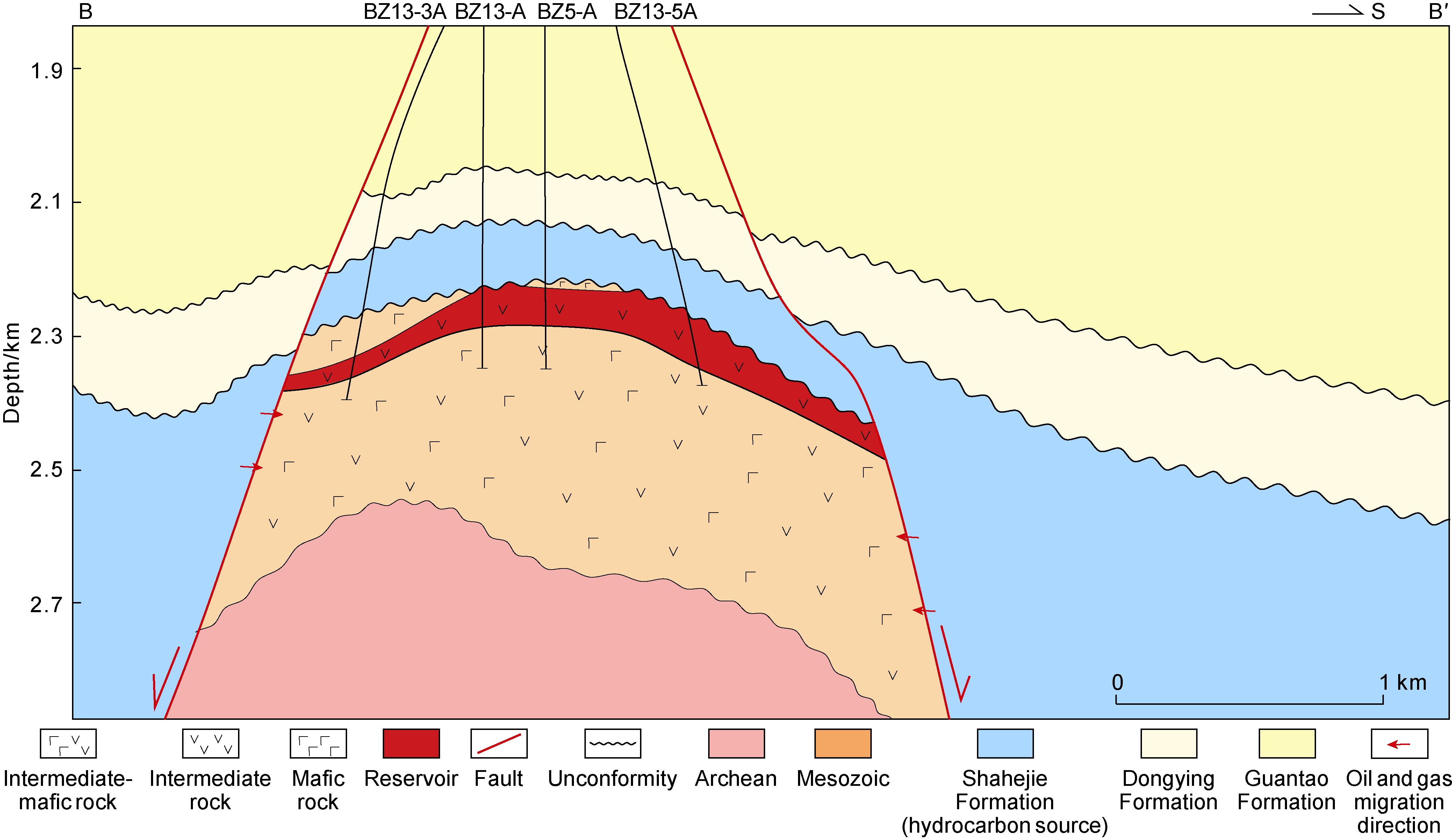 [19⇓⇓⇓⇓⇓⇓-26]. Guided by these findings, many high-yield volcanic oil and gas fields, such as BZ6-A, LD25-A and BZ8-A, have been successively discovered, demonstrating a huge potential of large-scale volcanic oil and gas reservoirs. Based on the Mesozoic volcanic exploration data of the Bohai Oilfield, especially several high-yield volcanic wells, this paper systematically analyzes the necessary conditions for the formation of large- and medium-sized volcanic reservoirs in the Mesozoic strata in the offshore Bohai Bay Basin, and points out the direction of future exploration of volcanic reservoirs.