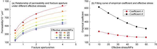 Fig. 4. Relationship of permeability with fracture aperture (a) and empirical coefficients at different stresses (b). |