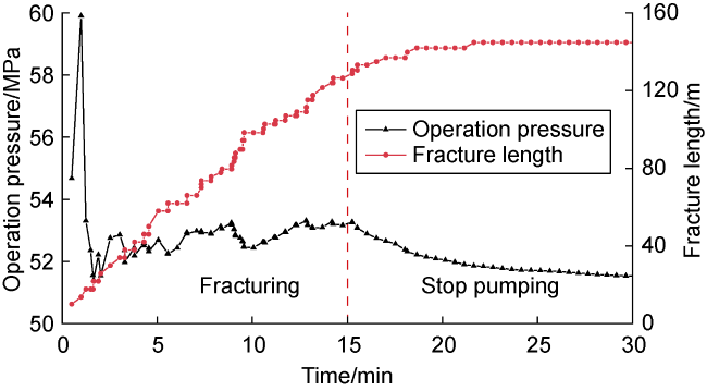 Fig. 11. Changes in bottomhole pressure and fracture length before and after pump-stopping. |